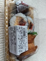 キオスクで売っていた。細め太巻き2個、小ぶりお稲荷さん2個。