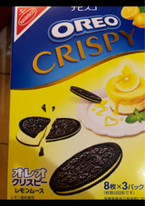 普通のオレオより薄いクッキー(クリスピー)にレモンムースがサンドされてます 内容量は8枚×3パック 味はレモンピールの様なほろ苦さとほんのりとした甘みのレモン風味 紅茶やコーヒーのお供等に良さそうです