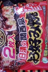 二枚入りでお得?! T社のお好み焼きはベチャとした感じで 日清は固い感じ (レンジの加減のせいか?) T社の方が烏賊ゲソが多く風味も良いけど これはキャベツしか確認出来ない。マヨネーズは付いて無い。