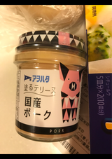アオハタの塗るテリーヌシリーズのポークです。 ビーフを1度食べてみましたがこちらのほうが食べやすい味わいですね。 食パンに塗って焼いたりカナッペなどを作って食べると美味しい。 瓶も可愛いので再利用しています。
