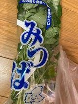 リピ…。57円❓安い.更に今日はイオンの会員割引5%offで更に3円ひかれ54円で購入していた。素晴らしい✨ 鶏肉で出汁を取り三つ葉と豆腐のお吸い物にしました。美味かったです。