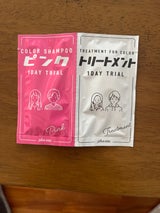 ピンクというより赤に近い感じに色が入った。 シャンプーはめっちゃ食紅みたいな色で手やお風呂場のタイルに付き、洗い流した後はギシギシ。でもトリートメントするとすごいサラッとまとまる感じになりました。