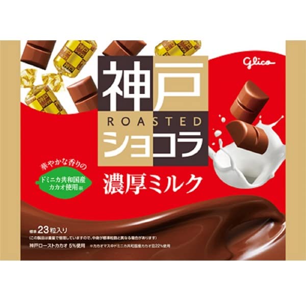 江崎グリコの、神戸ローストチョコ、個包装23粒入りです。 パッケージに”ドミニカ共和国産カカオ使用”と記載されています。 そのカカオの美味しさなのでしょう。香ばしく濃いカカオの味わいと、それに負けていないミルク感が、かなり高いレベルで両立しているチョコで、個包装粒チョコの中では一番本格派の味を出している商品だと思います。 他メーカーの個包装粒チョコは、どこかしらコストダウンして作った形跡が商品の味に反映されていて、残念感を感じてしまう事がしばしばあるものですが、この商品にはそれが全く感じられません。 そのため、食べた時の味わいの満足度が高い、美味しいチョコです。 この美味しさ、クォリティなら、価格も納得だと、私は思います。