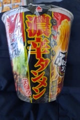 コンビニのワゴンセールで安売りしてたので購入しました。正式な商品名(極太!ぶっとメン濃辛タンメン大盛り味噌味)です。もちもち麺と濃い辛口のスープが旨いです。