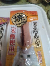 今日は爪切り&お風呂に入ったのでご褒美です。いつもはちゅーるですが今日は焼かつお。一気にたいらげました。
