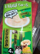 以前にもイオンで買ったことがありますが今回はホーマックで、テレビCMでも宣伝されている、いなばちゅーる。14グラム✕4本入り。愛犬も大好きなおやつですね。一生懸命ペロペロなめている仕草は可愛いです。また機会があれば買います。