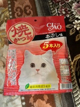 百円の焼きかつおだとちょっと大きいなって時は5本入りのサイズがちょうどいい。 色んな味があるけど本ぶし味はみんな好きかな? たまーに硬い時があるのでいつも柔らかめだともっと猫たちも喜んでくれそうです!