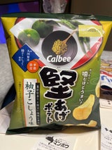 柚子胡椒だ! 柚子胡椒は好きだけど、堅あげでなくても良いかなと思った。 備忘録:堅あげポテトは焼き海苔が美味しい。