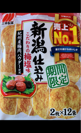 新潟仕込みシリーズは好きで、色んな種類を食べてます。梅塩味は、初めて見かけたので即買い。が、思ったより梅塩が酸っぱい。ちょっと期待はずれでした。