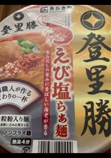 確かに登里勝のえび塩らぁ麺は週5で食べたくなるえび塩ラーメン。だがこれは麺は少ない・スープの袋は開けにくいなどコスパ等に見合わない値段。ガッカリ。