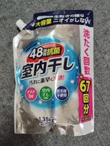第一石鹸の洗濯用洗剤「48時間抗菌 室内干し」です。 1.35kgと大容量詰替えです。 すすぎ1回、室内干しOK、蛍光剤不使用です。 生乾きの嫌なニオイがしません。 洗濯回数約67回分です。