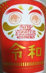 184円(税込)、77g(めん 65g)。新元号「令和」パッケージのカップヌードル。両眼の開いたダルマは縁起モノですね。味的にはスタンダード版で一食 353kcal。 ちなみに美智子さま(上皇后)の実家は日清製粉(小麦粉メーカー)で、この日清食品(NISSIN)とは別の会社です。