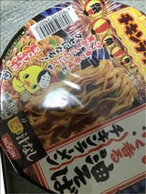 チキンラーメンの細い平たい麺の焼きそば。 麺が柔らかく食べやすい。 具材がほとんどないので、何か自分で加えたほうが良い。