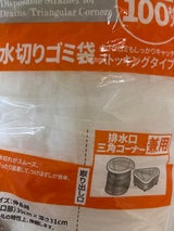 イオンで買った、イオン株式会社が販売している、トップバリュー、小さなゴミもしっかりキャッチ水切りゴミ袋ストッキングタイプ。排水口、三角コーナー兼用で水切りがスムーズだし、ぴったり装着できてつけはずしも簡単です。大容量100入りで税抜で460円と高めではありますが使ったらハマります。パッケージは変わりましたが何年も使っています。これまでさまざまな商品を使いましたが、この商品は別格ですね。網目が細かいので小さなゴミもしっかりキャッチしてくれるし水切れがとてもスムーズです。排水口のゴミ受けや容器や三角コーナーの口部にぴったりつけられるのがいいでさね。値段はいい値段がしますが使って損はない商品だと個人的に思います。