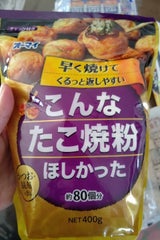 従来の一般家庭用のたこ焼き粉を脱し、群を抜いてライトに仕上がる美味しさ。プロ仕様には及ばないが、粉の固い団子っぽいたこ焼き粉から、一歩脱出したい人には良い。タネが水っぽく、少し焼きにくいので引っ付かないたこ焼き器で焼いてください。