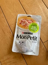 うちの子が大好きなモンプチシリーズのスープ🎵 特に夏場は水分補給と食欲不振時のサポート&ご褒美アイテムです。 中身がもっとストレス無く全部出せると良いなと思います。