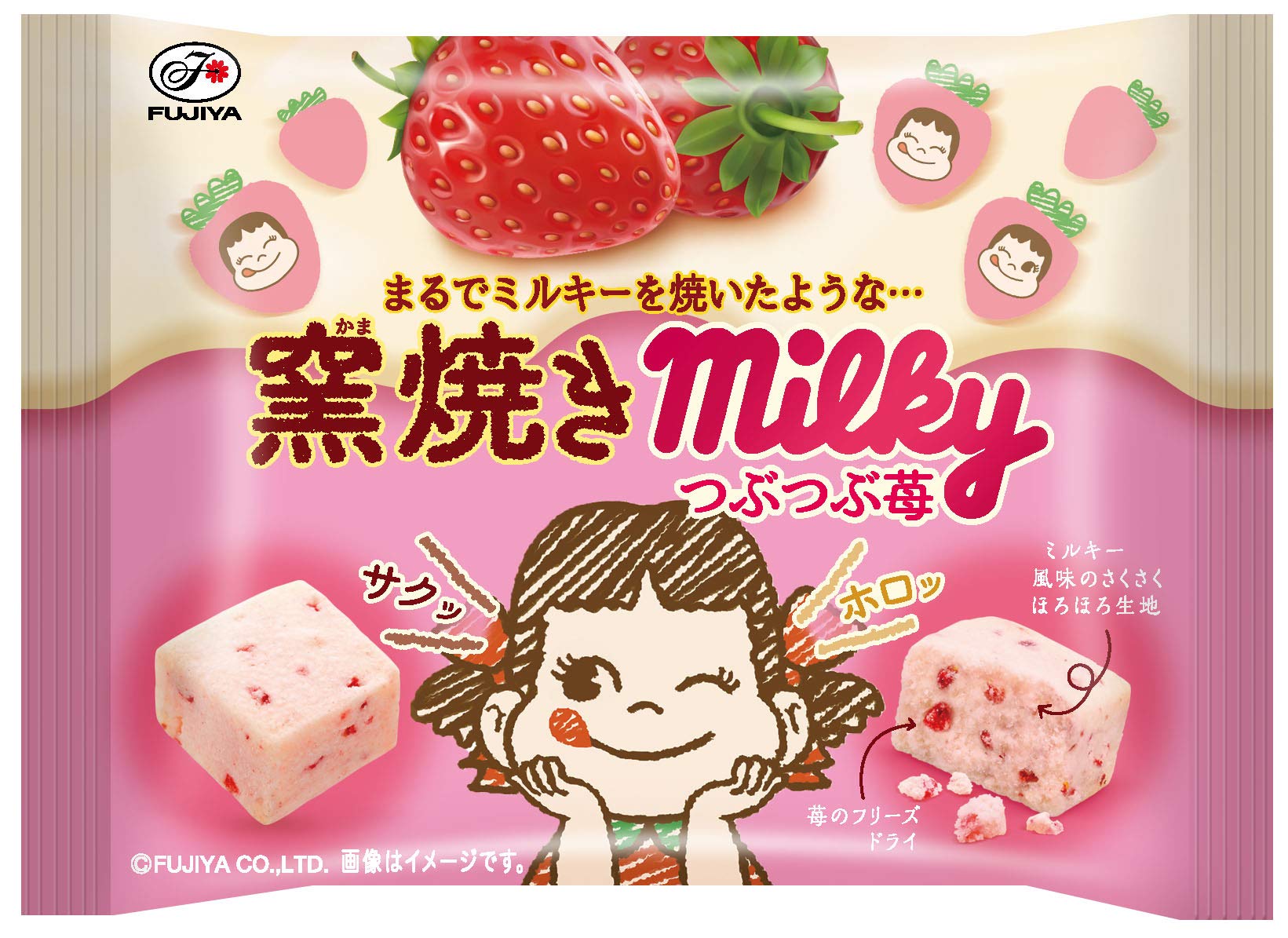 ミルキー風味の生地が、書いてある通りさくさくほろほろ!フリーズドライの甘酸っぱいつぶつぶ苺と合ってgood!!パッケージも可愛い!一粒食べるごとにペコちゃんみたいに笑顔に!