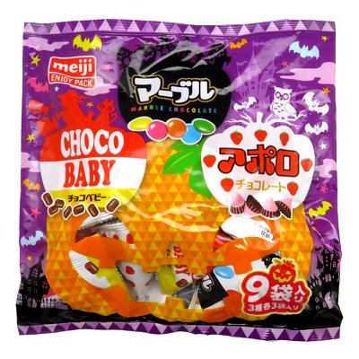 ハロウィンのパッケージに惹かれて購入。 マーブル・チョコベビー・アポロ人気の三種類のmix みんなで分けれて食べやすいサイズで魅力的です。
