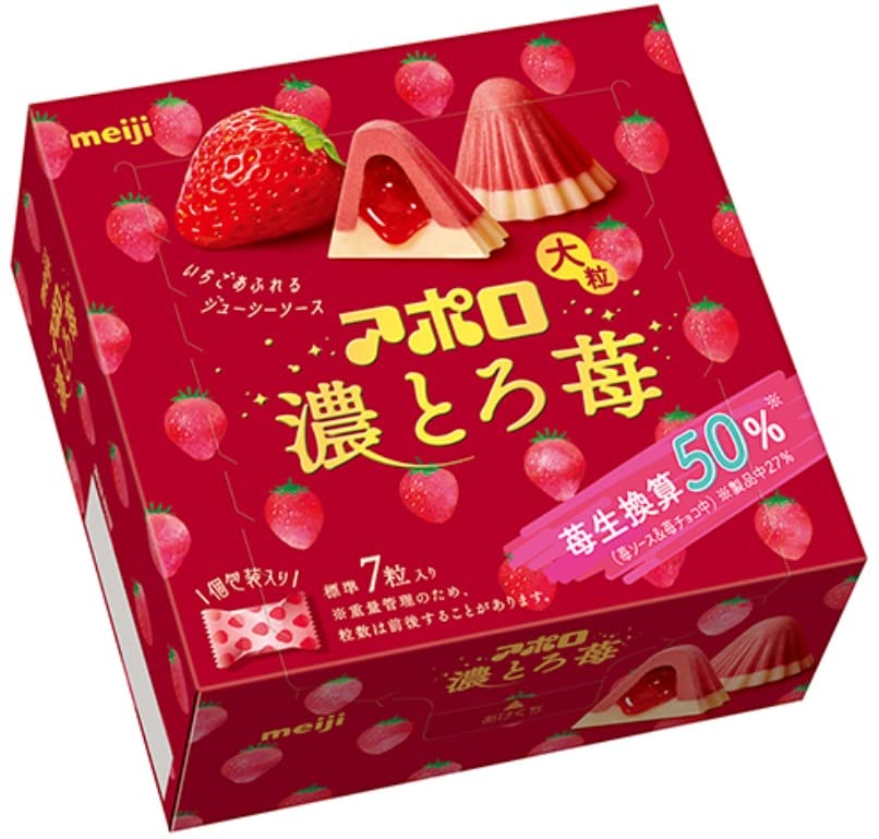 7個しか入ってないけど1粒が普通のアポロの3倍位の大きさ。中にとろっとしたイチゴペーストが入っててほんまにめっちゃ美味しい