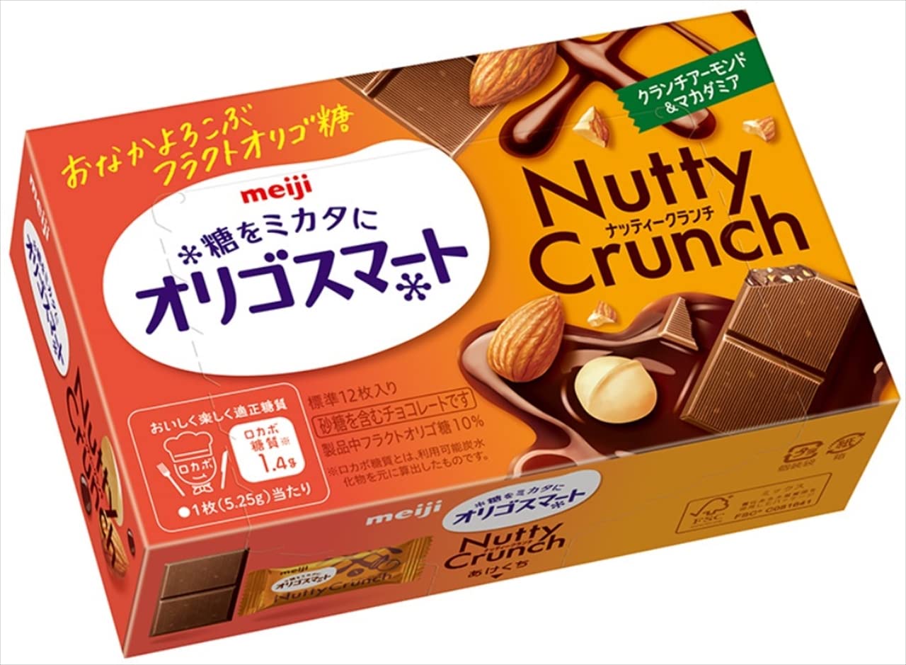 meijiオリゴスマ-トは、身体にも、糖類を心配している私にも、ピッタリのナッティクランチ、チョコレ-トでした❗️ 甘さ控えめで、Kcal半分、糖として吸収されずに、大腸迄届いて乳酸菌や、ビフィズス菌の栄養源になる⁉️ 凄いオリゴ糖❗️ 間食の目安1日.200kcalとして、1枚31kcalなので、3~5枚が目安ですね⁉️ 1箱12個包装で、とてもコンパクトな、チョコレ-トです。 クランチア-モンド&マカダミアは、ミニサイズでも、口当たり充分です❗️ 早速リピート、なんと10個、嫁にも薦めて、喜ばれました❗️ なんと1個税込139円で購入しました。