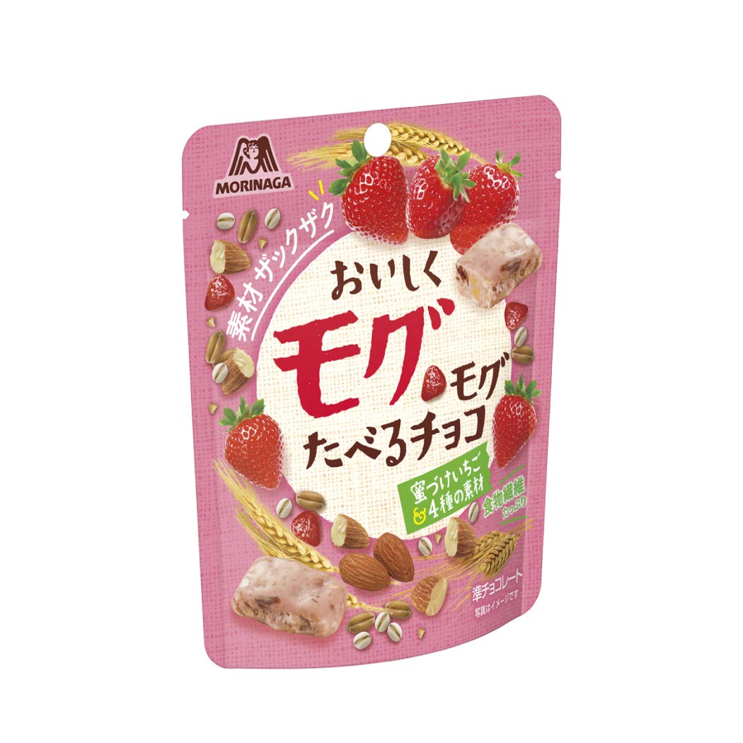 森永のモグモグたべるチョコ 甘すぎない蜜づけイチゴやナッツも入ってて美味しい 量が少ないのが残念