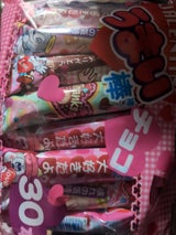 300円弱で30本入ってるうまい棒のチョコ味です。味も美味しく量は少し少なめですが適量だと思います。