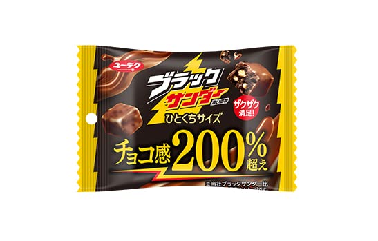 ブラックサンダーが食べやすく1口サイズになっているため 食べやすいです。 チョコ感が2倍とありますが 個人的にはそこまで変わってる感じは少ないです。 しかし、コーヒーのお供にはちょうどいいです。 ちょっとした休憩には持ってこいな品になっております。