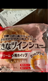 定番のカスタードとホイップのツインシューの隣に置いてあったので衝動買い。定番品よりイチゴの酸味が強い分あっさりしている。カロリーも40kcalほど低い。私はイチゴ味の方が好きです