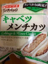 YAMAZAKIランチパックの新製品、キャベツメンチカツです。 キャベツ入りメンチカツとソースがサンドされています。 ボリューミーな食べ応えです。