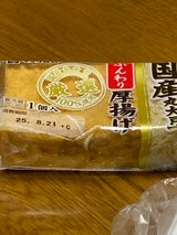 値下げされていたので購入しました。木綿豆腐タイプの厚揚げで、ゴワゴワしている食感。昔ながらの厚揚げですね。美味しいです。大根おろしとともに食べるのがオススメです。