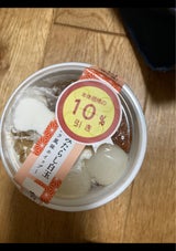 一番下にみたらしのタレのジュレっぽいものが入っています。上の半分にはふわふわホイップ、半分には白玉が3つのってます。ホイップの上にくるみがトッピング。胡桃のタレを想像して期待していたので少し残念でした。胡桃はホイップの上だけでしたが、しっかりと存在感はありました。ただ、白玉3つに対してみたらしのジュレが多すぎると思います。今回さ安売りしていたので購入しましたが、定価なら購入しないです。