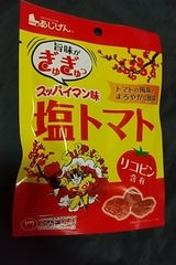 去年、沖縄旅行に行った時に立ち寄ったダイソーで「超スッパイマン 塩トマト」を買ってすごく美味しかったので地元のダイソーを何軒も探し回りました。 でも努力も虚しく見つからず諦めていました。 そして、一年後の今年また沖縄旅行をしたので同じダイソーに行きお目当ての「超スッパイマン 塩トマト」を見つけたのですが3袋しかなく在庫もないとのこと。 とりあえず3袋はゲットしました。 そして、似た商品のこちら「スッパイマン塩トマト」が5袋隣のラックにありました。 こちらも5袋全て購入しました。 「超〜」のほうをまろやかにした程よい酸味と甘さで、とっても美味しいです。7粒くらい入っていますが、一気に食べてしまいました。 夏は熱中症予防によさそうです。 地元では買えないので、大事に食べたいと思います。