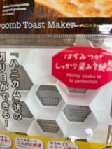 キャンドゥにて。とてもかわいくハニカム模様になります。他にスライスチーズを型抜きしてデコるタイプが2種類ありました。今までは田の字切りしたところにバターを乗せてトーストしていましたが、こちらの方がラクだし楽しい。