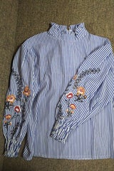 花刺繍ストライプのブラウス、思ったよりストライプの青が濃くて、刺繍も色がはっきりしていて派手かも、、、、