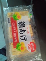 いつも行く八百屋さんにて。うすあげ×2袋、絹あげ、もち入り巾着、4つセットで¥100。 全て賞味期限間近な物ばかりですが、作り置きに使いました。(冷凍庫が無い、1ドアタイプの冷蔵庫を使っているので) お揚げさんは全部好きなので大助かりです。