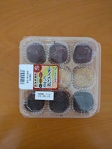 安売りで 298円 9個入り。ミニお萩の三色セット。つぶあん・きな粉・ごま味。いろんな味が楽しめてお買い得感がありますね。カロリーは 1食約 360kcalぐらいかな。