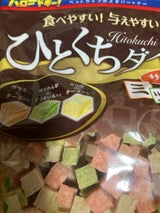 我が家の5ヶ月のワンちゃんにおやつ用で購入です。 一口サイズなのでお手やお座りふせなど躾にもパッと食べさせられて良いですね。
