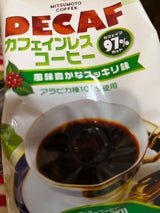 カフェイン97%カット。カフェインレスの粉の大パックは、あまりスーパーに置いていないので見かけたら買っています。たまたま安くなっていてラッキーでした。味はインスタントのよりは良い。