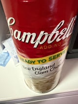 復活のクラムチャウダー缶。店舗でも食べられるメニューを持ち帰られる。本格的で濃厚なクラムチャウダーで、かなりの重量感。